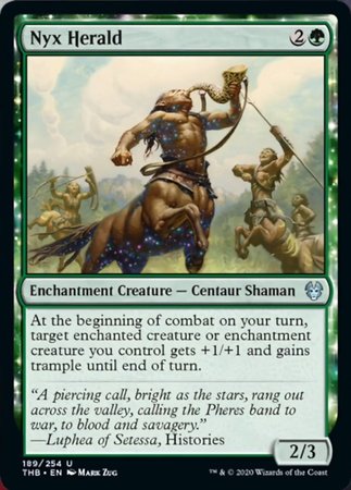 At the beginning of combat on your turn, target enchanted creature or enchantment creature you control gets +1/+1 and gains trample until end of turn.
