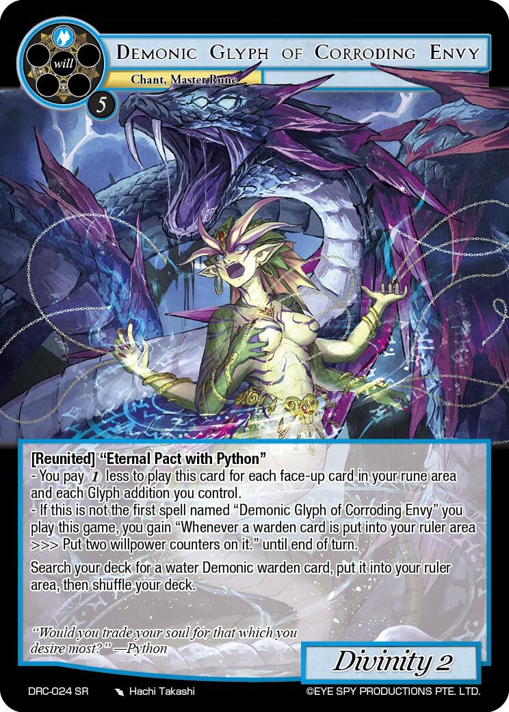 [Reunited] "Eternal Pact with Python" - You pay 1 less to play this card for each face-up card in your rune area and each Glyph addition you control. - If this is not the first spell named "Demonic Glyph of Corroding Envy" you play this game, you gain "Whenever a warden card is put into your ruler area >>> Put two willpower counters on it." until end of turn. Search your deck for a water Demonic warden card, put it into your ruler area, then shuffle your deck.