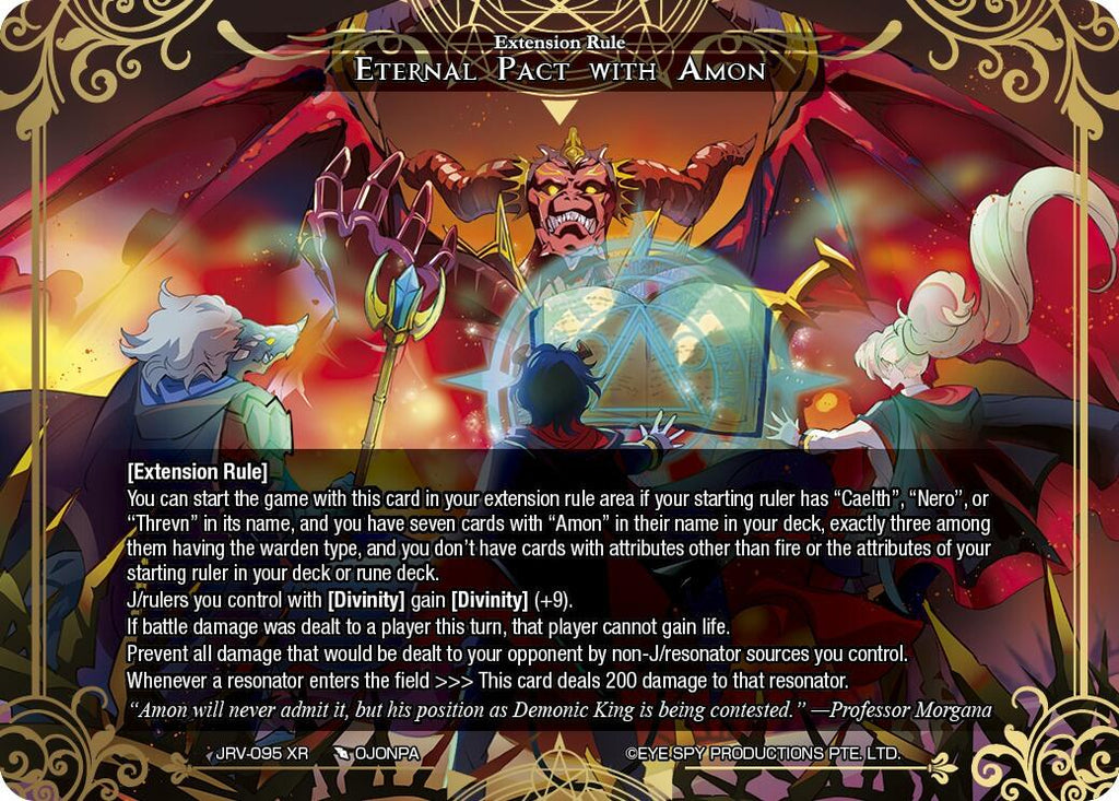 You can start the game with this card in your extension rule area if your starting ruler has "Caelth", "Nero", or "Threvn" in its name, and you have seven cards with "Amon" in their name in your deck, exactly three among them having the warden type, and you don't have cards with attributes other than fire or the attributes of your starting ruler in your deck or rune deck.