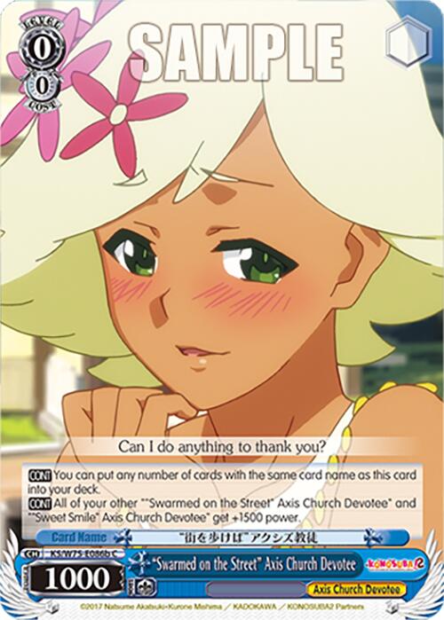 [CONT] You can put any number of cards with the same card name as this card into your deck. [CONT] All of your other ""Swarmed on the Street" Axis Church Devotee" and ""Sweet Smile" Axis Church Devotee" get +1500 power.