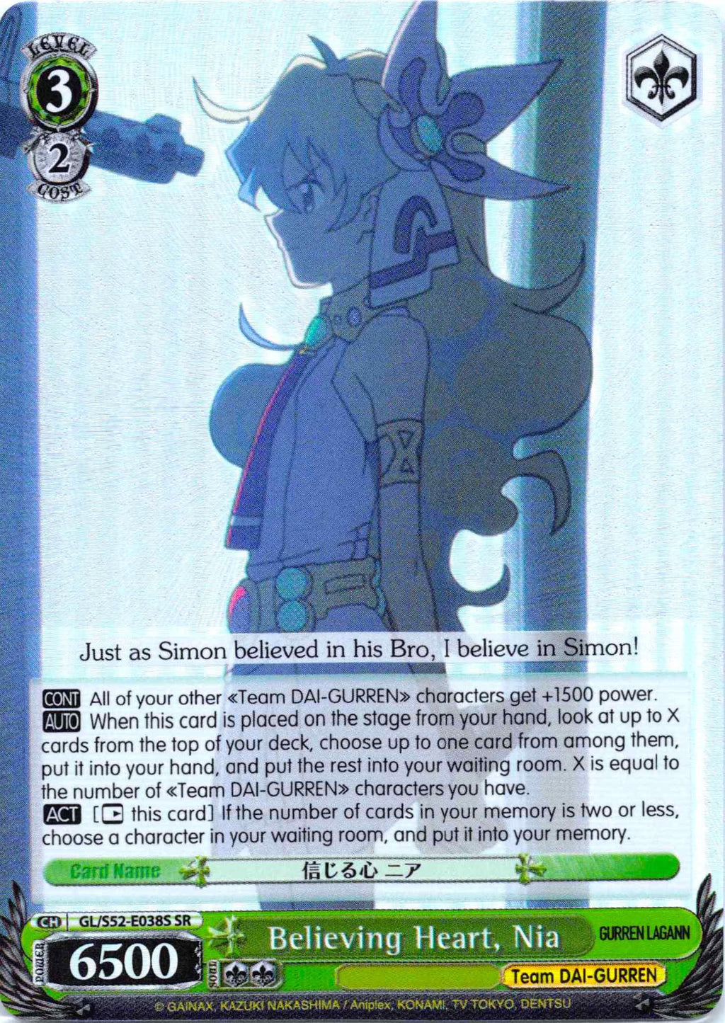 [CONT] All of your other "Team DAI-GURREN" characters get +1500 power. [AUTO] When this card is placed on the stage from your hand, look at up to X cards from the top of your deck, choose up to one card from among them, put it into your hand, and put the rest into your waiting room. X is equal to the number of "Team DAI-GURREN" characters you have. [ACT] [[REST] this card] If the number of cards in your memory is two or less, choose a character in your waiting room, and put it into your memory.