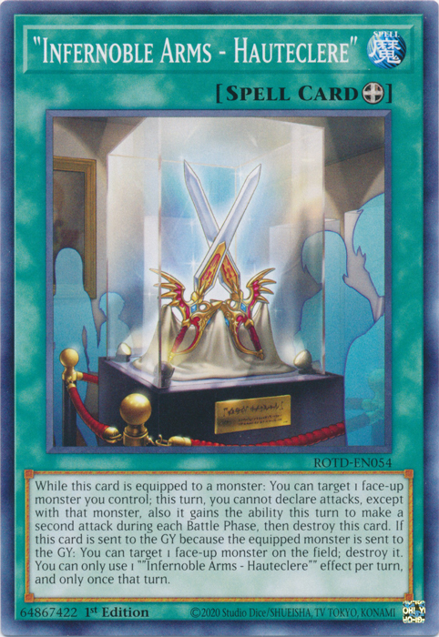While this card is equipped to a monster: You can target 1 face-up monster you control; this turn, you cannot declare attacks, except with that monster, also it gains the ability this turn to make a second attack during each Battle Phase, then destroy this card. If this card is sent to the GY because the equipped monster is sent to the GY: You can target 1 face-up monster on the field; destroy it. You can only use 1 ""Infernoble Arms - Hauteclere"" effect per turn, and only once that turn.